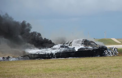 Here we have our first billion dollar accident (and we ' re only #7 on the list). This B-2 stealth bomber crashed shortly after taking off from an air base in Guam on February 23, 2008. Investigators blamed distorted data in the flight control computers caused by moisture in the system. This resulted in the aircraft making a sudden nose-up move which made the B-2 stall and crash. This was 1 of only 21 ever built and was the most expensive aviation accident in history. Both pilots were able to eject to safety.